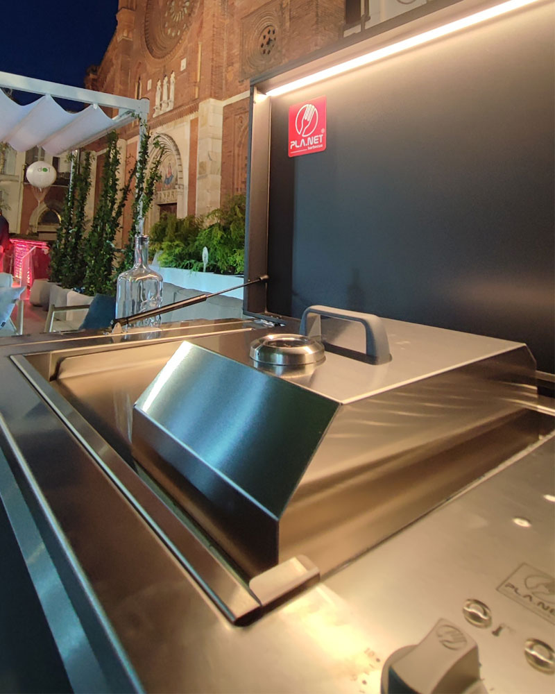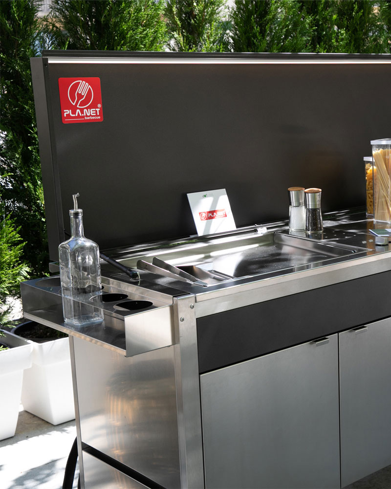 PLA.NET Outdoorküche OASI 205.C5 ist kein traditioneller Plancha-Gasgrill, sondern eine mit Gas betriebene Kochfläche, die sich schnell erhitzt und eine gesunde und schmackhafte Ernährung das ganze Jahr ermöglicht. Die Variante T1 ist mit dem Plancha OASI IN.55 F und 2 Brennern ausgestattet und garantiert umfassende Variationsmöglichkeiten hinsichtlich Temperatur und Grillanwendung, wodurch ein exzellentes Garergebnis von Grillgut gewährleistet ist. Die durchgängige Grillfläche besteht aus verzugsfreiem Edelstahl und wird schnell erhitzt. Sie ist im optimalen Größenverhältnis zu den darunterliegenden Brennern konstruiert, um eine perfekte und gleichmäßige Erhitzung der Fläche bei geringem Verbrauch und Wärmedispersion zu erzielen. Die doppelwandige Konstruktion trennt die Brennkammer von der Außenstruktur. Um das Abfließen des Fetts zu erleichtern, ist sie leicht abgeschrägt. So grillen Sie auch ohne viel Öl und vermeiden, dass durch in die Flamme tropfendes Fett giftiger Rauch entsteht. Der Gasgrill besitzt besitzt eine modernste Sicherheitsabschaltmechanismus: Sollte die Flamme aus irgendeinem Grund erlöschen, so schließt sich die Gaszufuhr automatisch. Die Seitenwände sind mit Lüftungsöffnungen ausgestattet, um die Temperatur des Grills möglichst niedrig zu halten.
