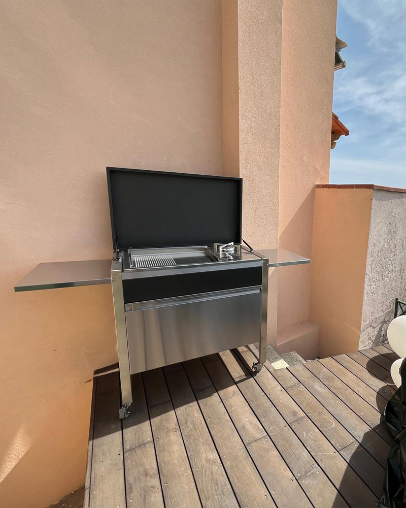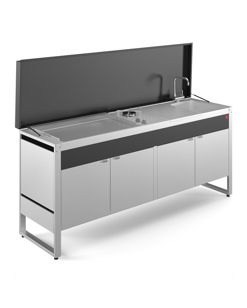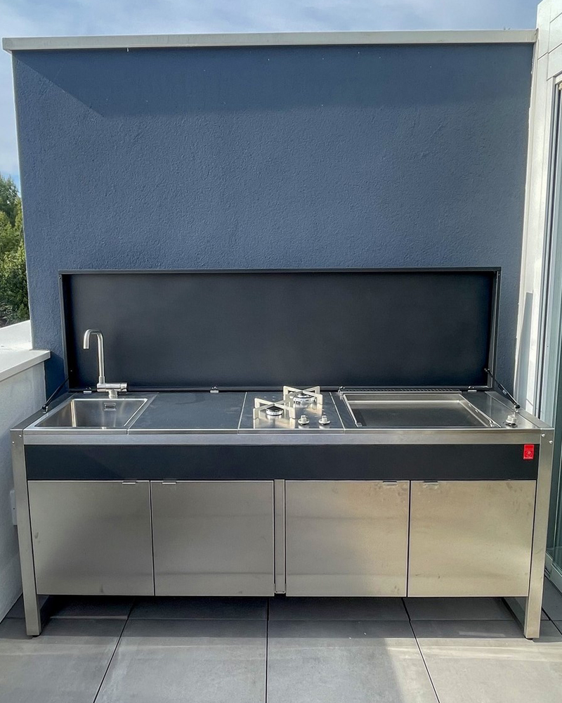 Auch der Plancha wird bei PLA.NET komplett intern hergestellt und zeichnet sich durch eine hochwertige Verarbeitung aus. Ausgestattet mit zwei Vasistastüren, die den Zugang zum Innenbereich ermöglichen, das für die Aufbewahrung der Gasflasche sowie des Geschirrs oder der Reinigungsmittel praktisch ist. Die gesamte Arbeitsfläche wird von einer durchgängigen Abdeckung komplett aus Edelstahl geschützt, die mit Hilfe von Kolben geöffnet und geschlossen werden kann, sodass der Plancha Grill und weitere Einbauten vor Umwelteinflüssen und Staub geschont werden. Die modulare Outdoor Küche gibt es in 8 verschiedenen Varianten mit unterschiedlichen Plancha Grills in mehreren Größen. Ebenso haben Sie die Wahl zwischen Gas- oder Elektro-Plancha und die Grillfläche der Gas-Plancha kann nicht nur aus einer komplett glatten Platte bestehen, sondern hat auch einen geriffelten Teil. Neben dem Plancha Grill ist je nach Variante ein Gaskochfeld oder Induktionskochfeld verbaut. In fast allen Varianten befindet sich außerdem ein Spülbecken inkl. einer versenkbaren Batterie. Optional können Sie die Outdoor Küche auch mit Schwerlastrollen ausstatten, sodass Sie Ihre PLA.NET Outdoorküche OASI 205.C5 auch mobil nutzen können. Ohne großen Montageaufwand. Die Oasi 205 Outdoor Küche von Pla.net Plancha bietet viele Funktionen und lässt Sie leckere Gerichte im Freien zubereiten. Ein einzigartiges, stilvolles und zeitloses Design, sodass Ihre Outdoor Küche auch noch in vielen Jahren ein Eyecatcher in Ihrem Outdoor-Bereich sein wird.